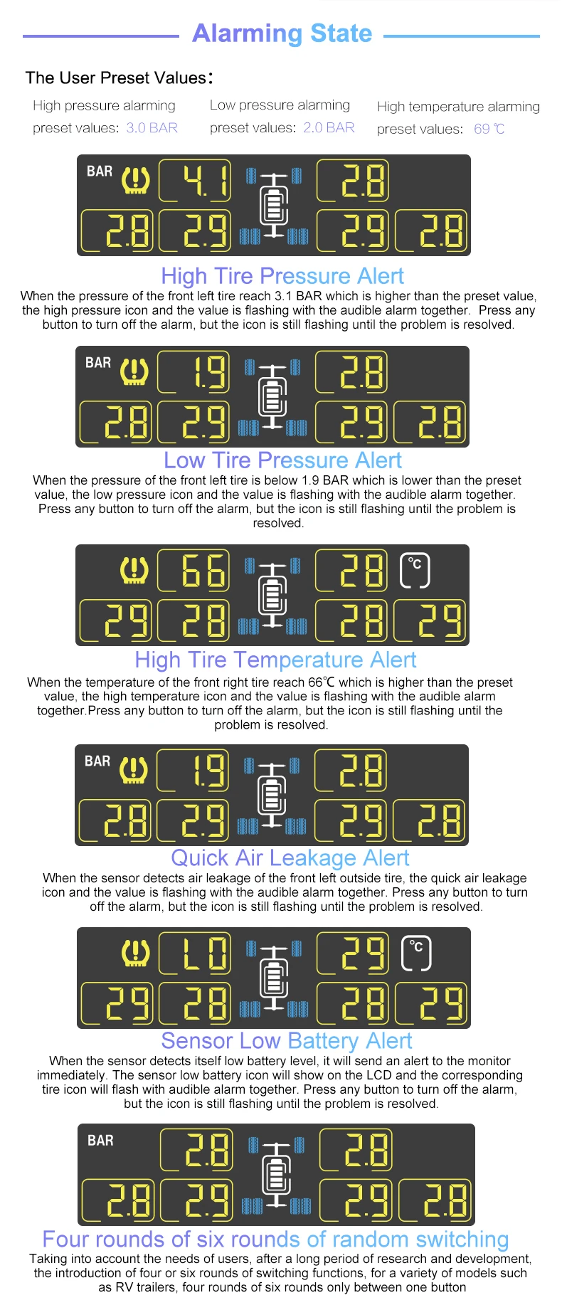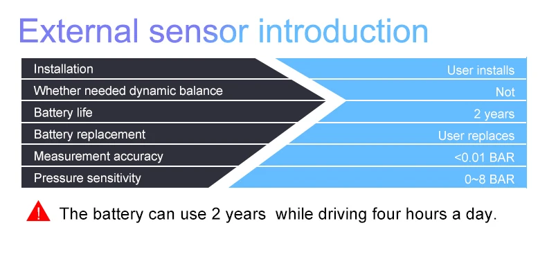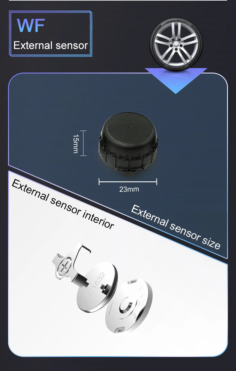 08. Специальная беспроводная радиочастотная технология TPMS, обновление данных датчика в реальном времени, быстрая сигнализация и всплеск экрана, когда давление и температура в шинах являются ненормальными