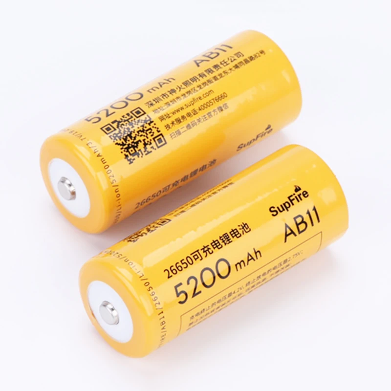 1. Type: 26650 Li-ion battery. 2. Capacity: 5200mAh. 3. Standard voltage: 3.7V. 4. Charge voltage: 3.7-4.2V 5. Discharge termination voltage: 2.75V 6. Charge termination voltage: 4.2V 7. Sizer: 26*65mm.