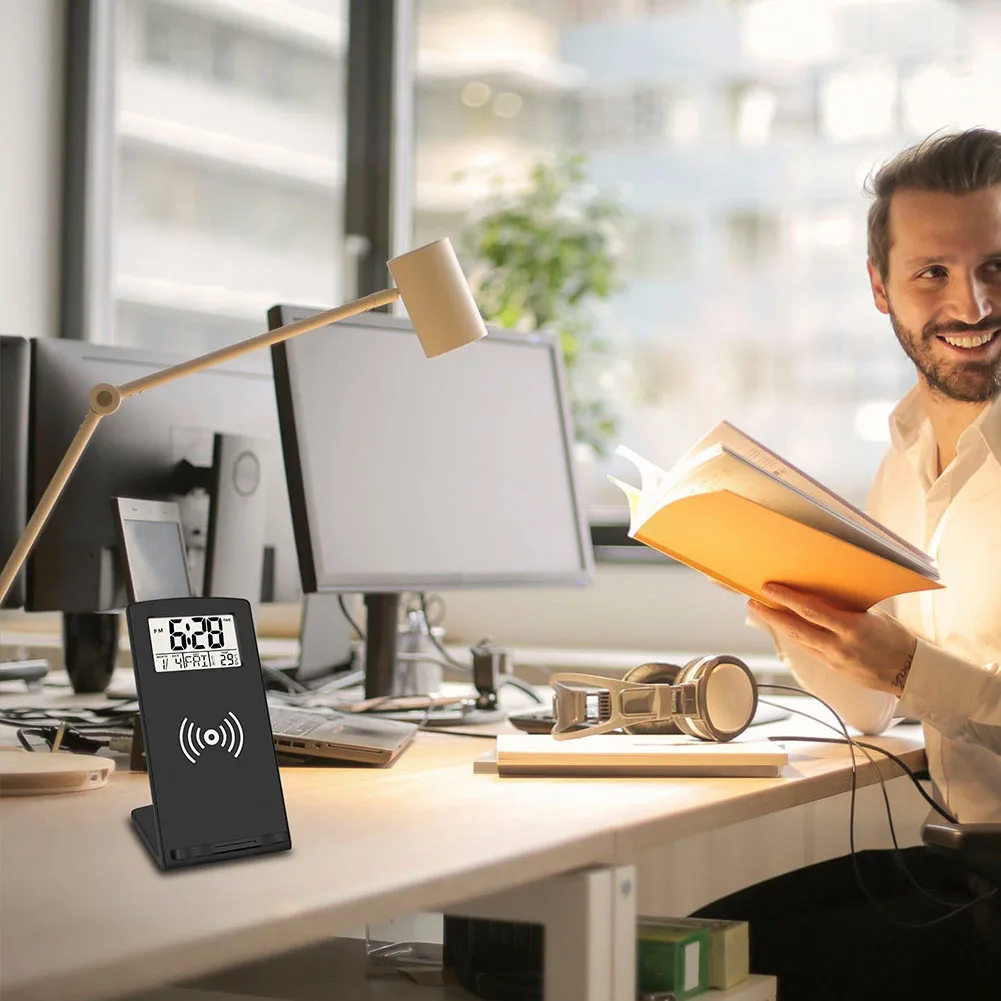 Особенности: Беспроводная зарядка Qi-Просто поместите ваш Совместимый телефон Qi с беспроводной зарядкой поверх часов, и он начнет зарядку автоматически. Функция календаря и часов: отображение часов, минут, даты, месяца, недели и 12/24 часов. Отображение температуры как по Фаренгейту, так и по Цельсию. С функцией переключателя температуры по Фаренгейту и Цельсию. Будильник с функцией повтора. Изготовлено из хорошего АБС-пластика, эти часы легкие и элегантные; Большой и яркий светодиодный экран, идеально подходит для пожилых людей, прост в эксплуатации. Идеальный размер и гладкий внешний вид, он может использоваться в качестве держателя телефона, это удобно для вас, чтобы играть в мобильные телефоны при зарядке. Параметры: Материал: АБС-пластик Цвет: черный Размер изделия: 8*9*15 см Размер упаковки: 90 мм * 155 мм * 105 мм Вес: 200 г Источник питания: Встроенный аккумулятор Посылка включает в себя: 1 x часы-будильник USB кабель (1 шт.);