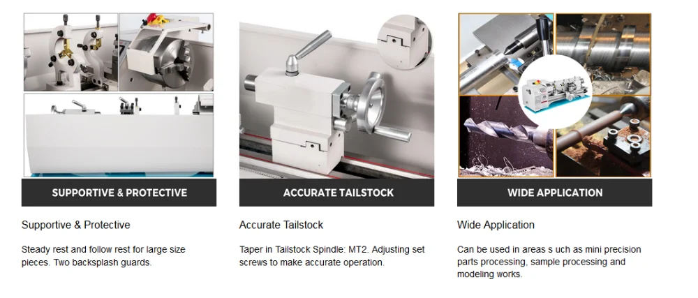 220x750 мм точность металлический токарный мини-станок особенности 1.1KW мотор, 3-кулачковый патрон, MT5 шпинделя с коническим отверстием производства, MT2 конус, разработан, чтобы выполнять различные виды металла токарная обработка, простой в эксплуатации. Благодаря высокочастотному процессу закалки и прецизионному измельчению высококачественной чугунной кровати. Скорость вращения шпинделя 500-2250 ± 10% об/мин постоянно регулируется. Устойчивый отдых и отдых для больших размеров или/и тяжелых заготовок.