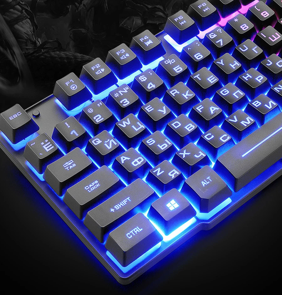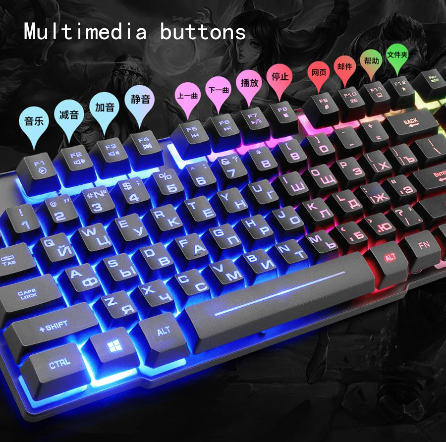 Технические характеристики изделия -Особенности: плавающая клавиатура с подсветкой -Типы: набор проводной клавиатуры мыши/Набор игровой клавиатуры мыши -Размер клавиатуры: 44,5 см x 13,5 см -Размер мыши: 13x7 см -Длина кабеля: 1,5 м -Мышь Регулируемая DPI : 800 DPI /1600 DPI / 1800 DPI /2000 DPI -Использование соединения bInterface: USB -Количество клавиатуры: 104 клавиши -Клавишный колпачок робота/подвески -Функция: мультимедийная кнопка, водонепроницаемая (функция защиты от брызг, есть дренажное отверстие в нижней части, поэтому клавиатура не может быть замочена в воде) Кнопка переключения мультимедиа Богатые мультимедийные кнопки позволяют быстро переходить между работой и воспроизведением, а также позволяют уменьшить Тривиальные операции и повысить эффективность. 1-Fn + F1: музыка 2-Fn + F2: снижение звука 3-Fn + F3: добавить звук 4-Fn + F4: бесшумный 5-Fn + F5: Предыдущая песня 6-Fn + F6: Предыдущая песня 7-Fn + F7: Play 8-Fn + F8: стоп 9-Fn + F9: Веб-страница 10-Fn + F10: почта 11-Fn + F11: помощь 12-Fn + F12: папка