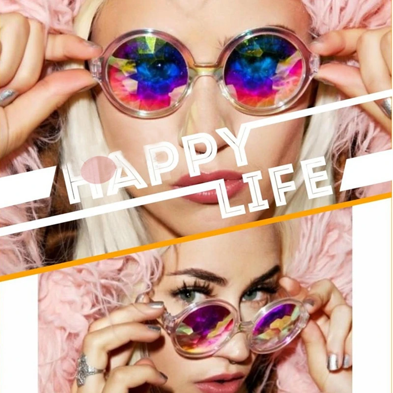3.See reality through the clear center and experience the intense kaleidoscope effect on the edges of the lens. Rainbow Kaleidoscope Glasses offer the MOST INTENSE Rainbow Kaleidoscope effect using Rainbow Spectrum Technology and include all the colors of the rainbow within the Rainbow Kaleidoscope Glass Crystal Lenses !