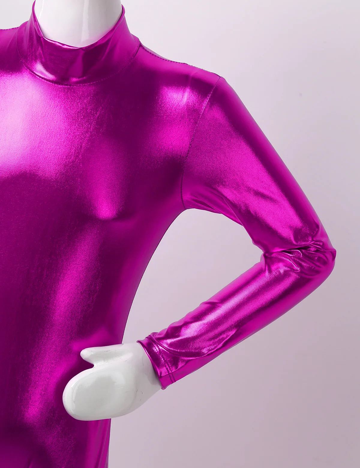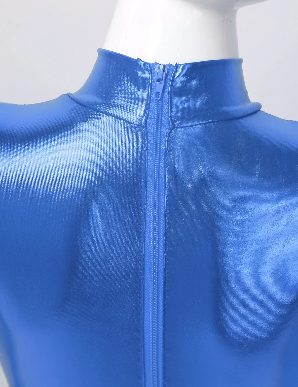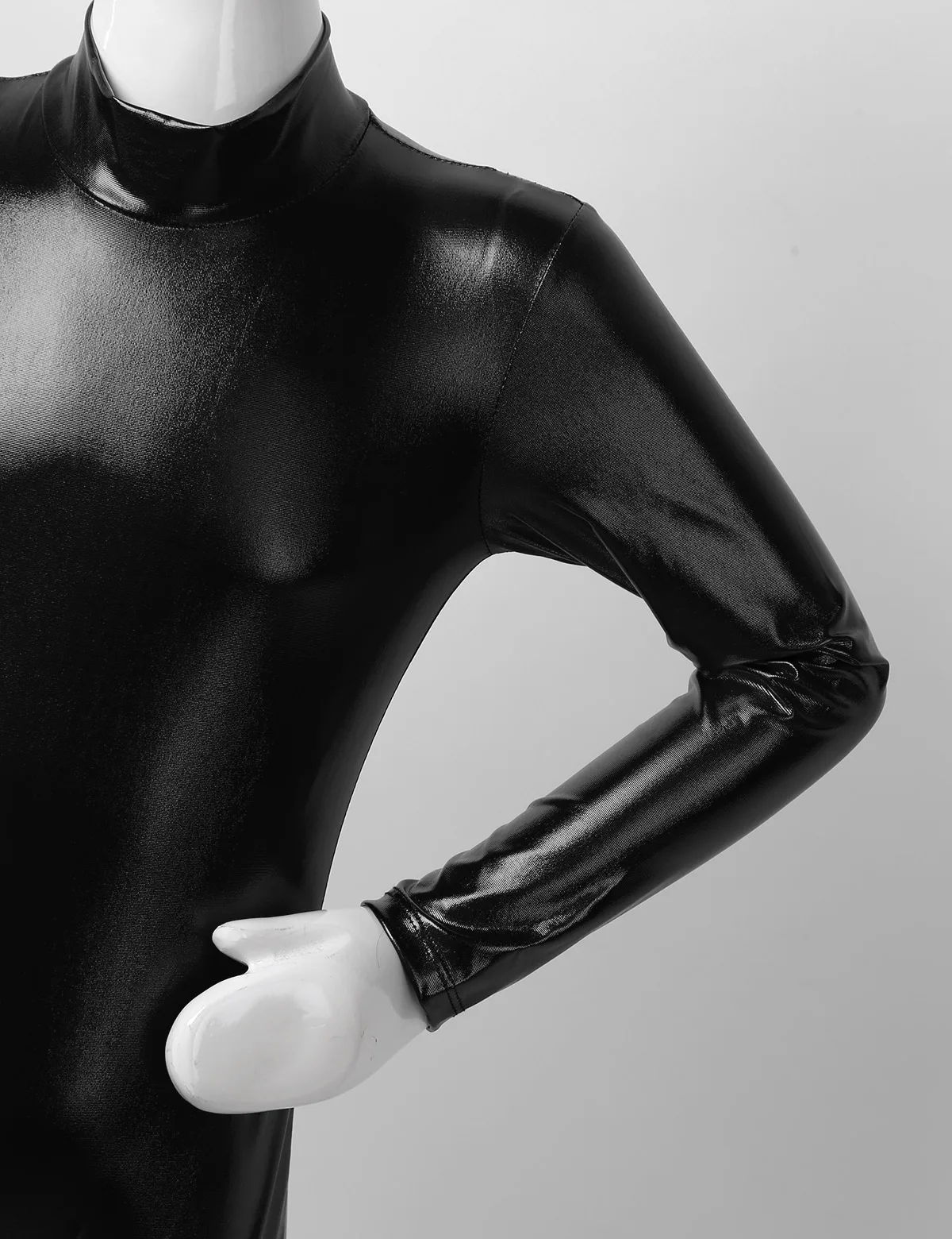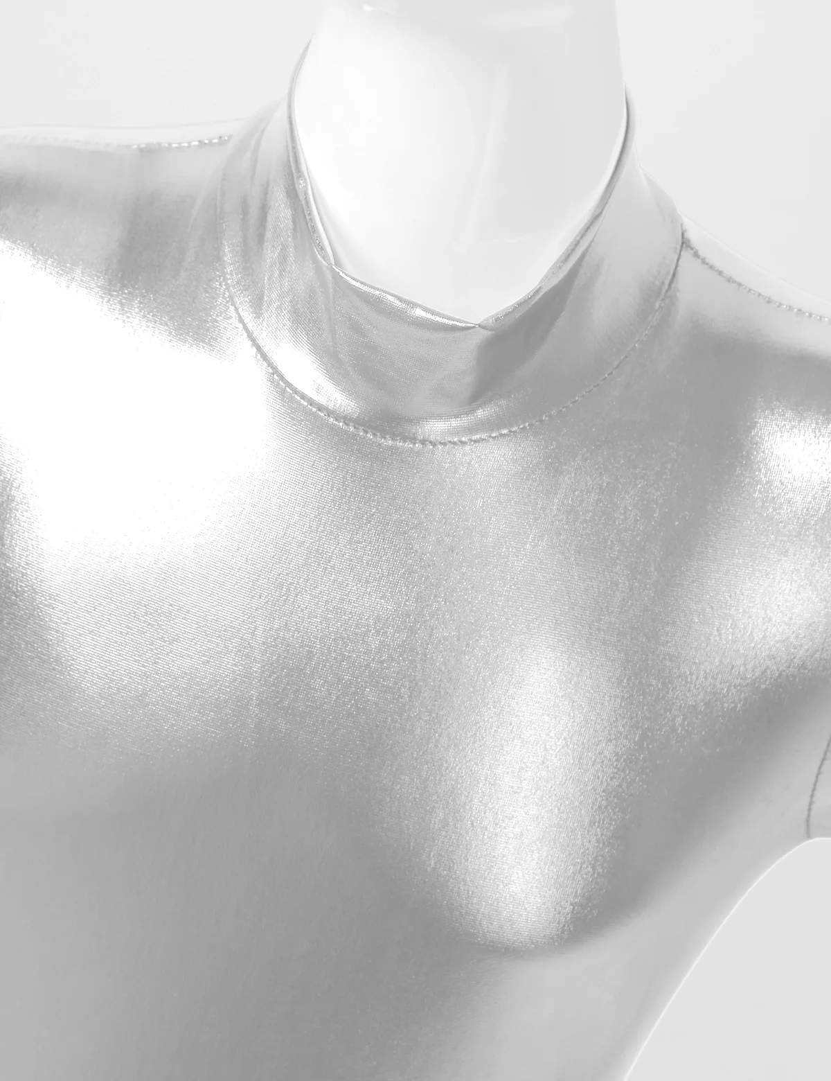 Длинные рукава, ложный вырез, застежка-молния сзади, чтобы легко одеть. Глянцевый металлик.