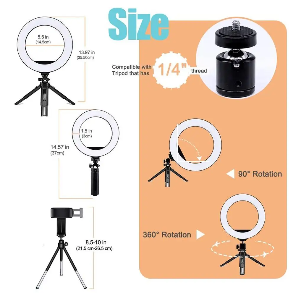 1. Кольцевой светильник с регулируемой яркостью: светодиодный кольцевой светильник с светодиодный лампой обеспечивает яркий светильник. Три режима освещения: белый, теплый желтый и теплый белый. Каждый из этих 3 режимов освещения имеет 10 видов регулируемой яркости, которые могут удовлетворить ваши различные потребности при цветовой температуре 3200-5500K. Яркий ореол делает вас более красивым!1 пульт дистанционного управления Bluetooth