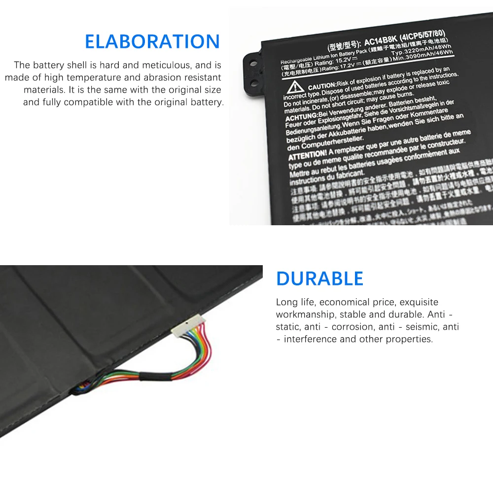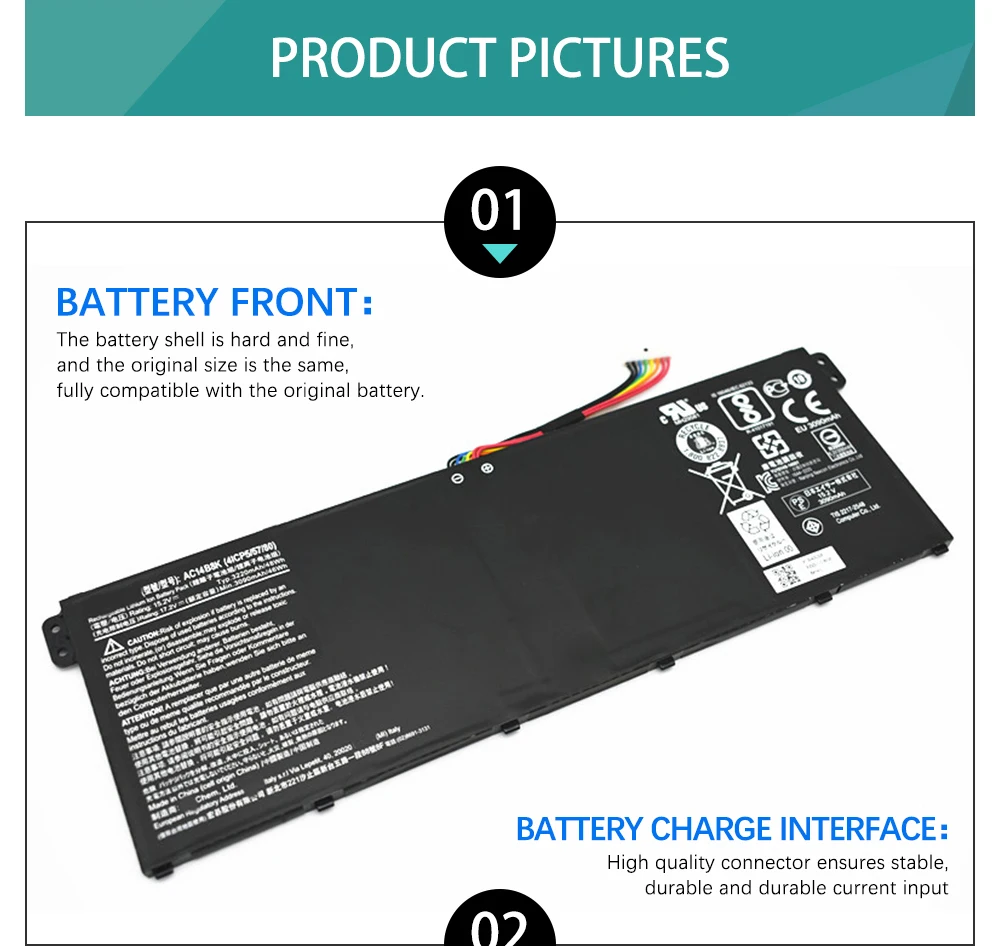 Модель: AC14B3K Напряжение: 15,2 в Емкость: 49,7 Вт/3270 мАч Оригинал: Оригинал для acer Количество ячеек: 4 ячейки Цвет: черный Совместимая модель ноутбука: Для Acer Extensa 2508 2519 Для Acer Packard Bell EasyNote TF71-BM TG71-BM TG81-BA TG83-BA Для Acer Aspire V3-371 V3-111P V3-371 Для Acer Aspire V5-122 V5-132 V5-122P V5-132P Для Acer Aspire E3-111 E3-112 E3-112M Для Acer Aspire ES1-111 ES1-111M ES1-131 ES1-311 ES1-331 ES1-512 ES1-520 ES1-521 ES1-531 ES1-731 ES1-731G Для Acer Aspire R3-131T Для Acer Aspire R5-431T R5-471T R5-571T R5-571TG Для Acer Aspire R7-371T R7-372T Для Acer Gateway NE512 Для Acer Swift 3 SF314-51 SF314-51-345H SF314-51-3632 Для Acer Aspire R 11 R3-131T R3-131T-C0A7 Для Acer Aspire S14 Series Сменный номер детали: AC14A8L KT.0030G.001 аккумулятор большой емкости (3ICP7/61/80)