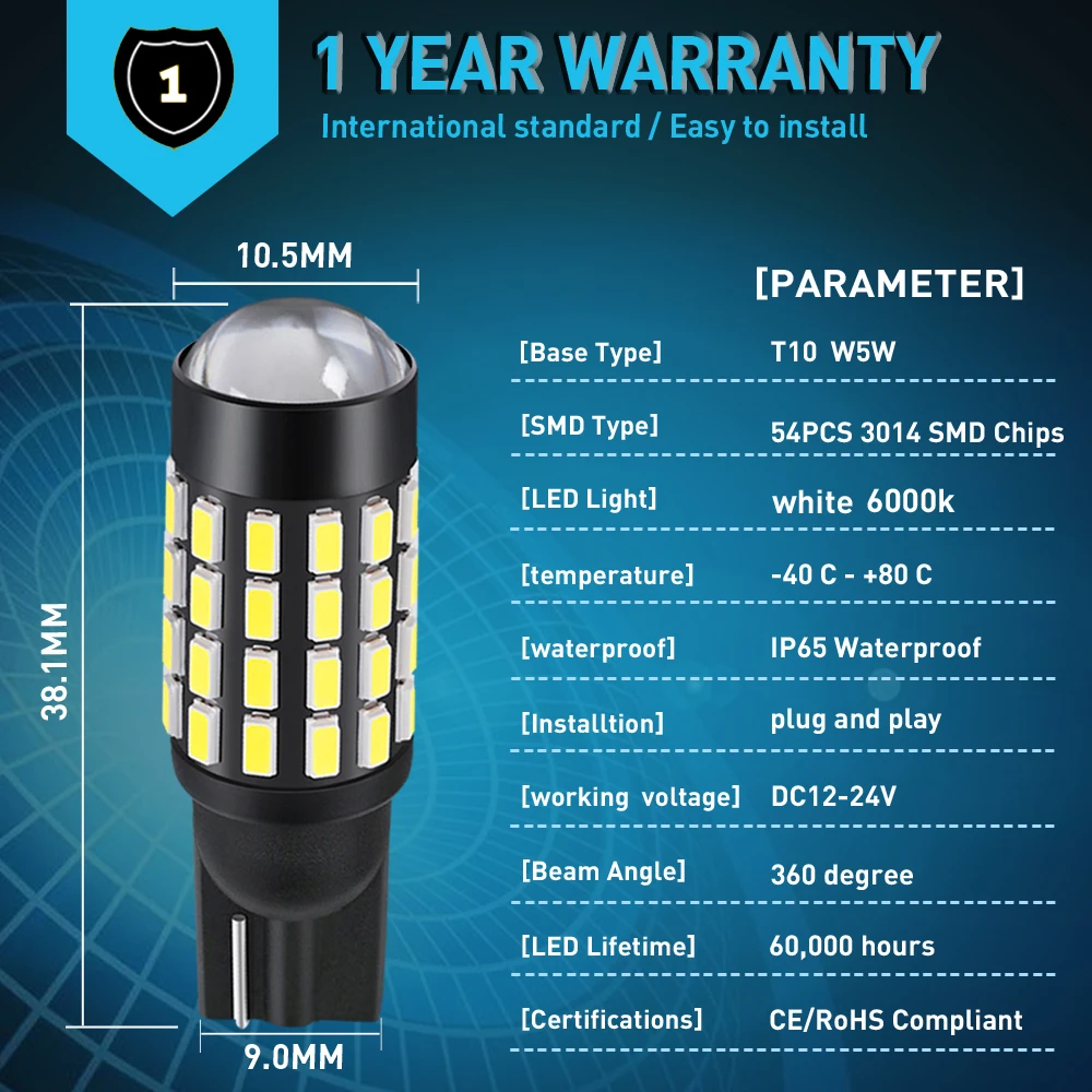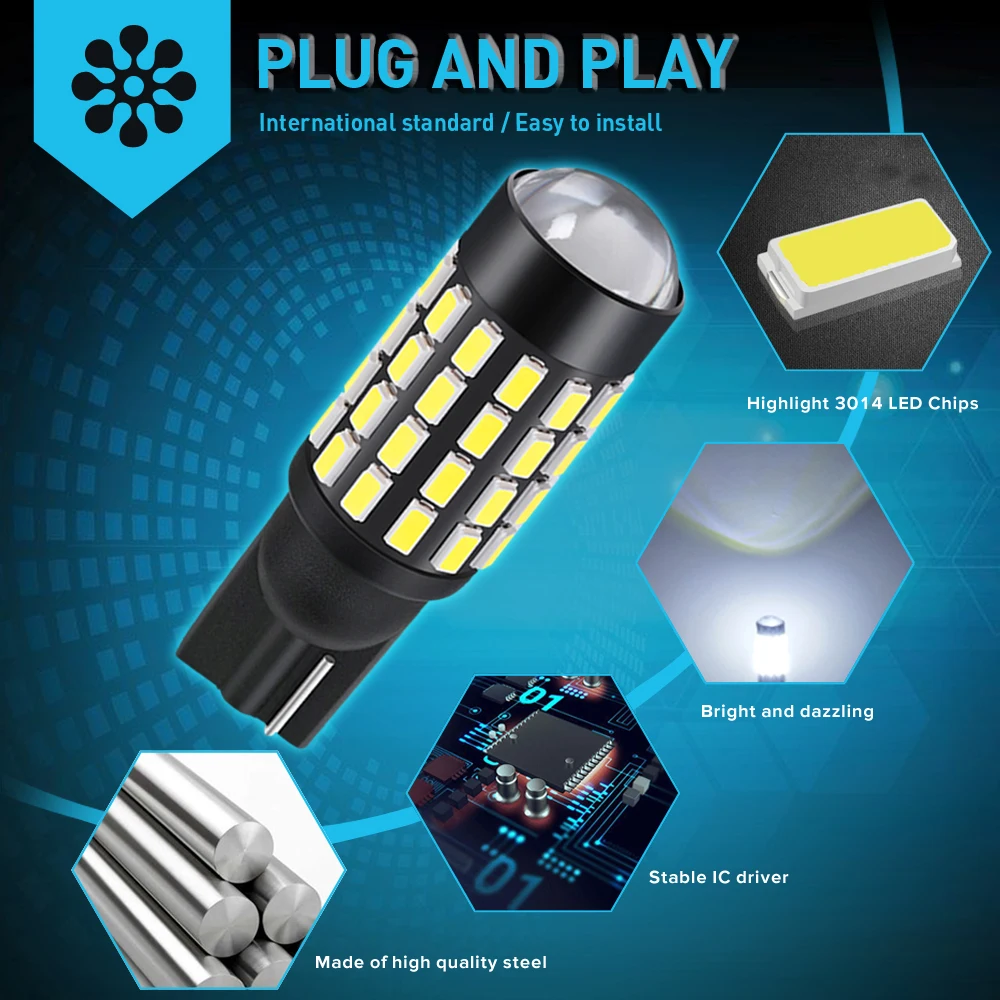 1 Всего 54 шт. 3014 SMD чипы 2 стандартных T10 , 99% близко к оригинальным галогенным лампам 3 Стабильный IC драйвер, Canbusl без ошибок, подходит для автомобилей 12 В