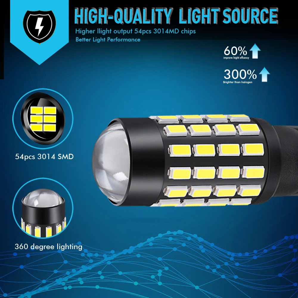 1. Canbus, без ошибок, без ошибок 2. Супер яркий с чипами 54SMD 3014 3. Неполярный дизайн, просто установите его непосредственно