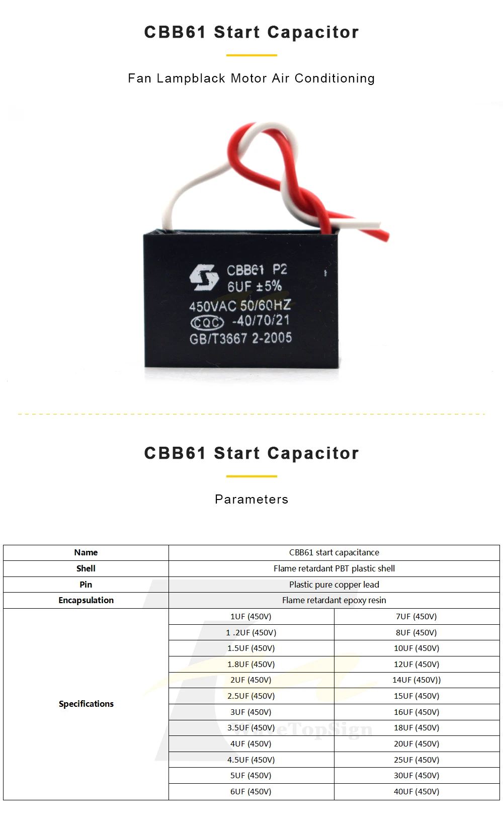 CBB61 используется для запуска однофазного двигателя переменного тока Гц. Продукт имеет небольшой размер, долгий срок службы, высокие пропорции и Самовосстанавливающиеся характеристики. Широко используется для запуска и работы вентиляторов, потолочных вентиляторов, напольных вентиляторов, вытяжек и промышленных ветровых турбин. Для изготовления металлизированной пленки ZnAl edge, которая может выдерживать большие Сила тока и высокая электрическая прочность. Безопасен и надежен в использовании Вставки, независимо от положительных или отрицательных полюсов, могут быть подключены к любому Способ. Пластиковый чехол выглядит прямо, имеет хороший вид Самовосстанавливающийся, высокие потери частоты небольшие, срок службы изоляции высокий.