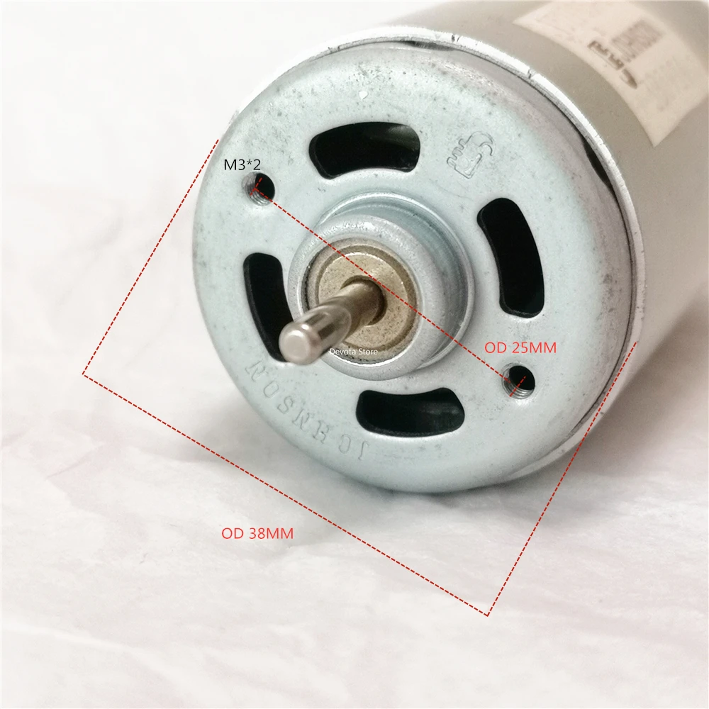 Описание: 1. Для запуска двигателя требуется большой ток. 2. Предложения по источнику питания: аккумулятор большой емкости, источник питания с переключением высокой мощности (между 15-20A.) Основное применение: Для электрической ручной дрели, мощный перезаряжаемый Электрический инструмент: электрическая отвертка, электрическая сабельная пила, электрическая угловая шлифовальная машина, детская тележка; Бытовая техника: ручной пылесос/сок, миксер для крема и т. д. DIY Применение: Ручная электрическая Шлифовка/сверление/полировка, а также различные модели силовых двигателей. (Из-за высокой скорости двигателя, не шариковый подшипник, не должен нести слишком много радиальной силы, чтобы не повредить двигатель!)