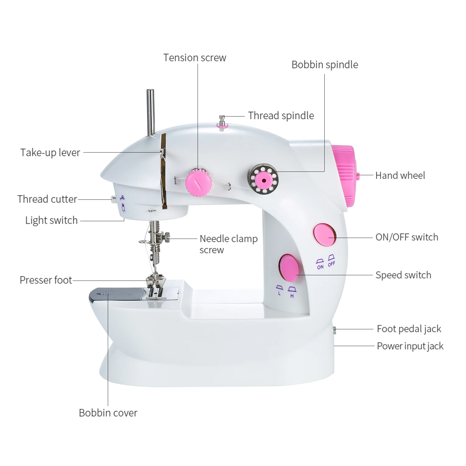 Двойная мощность и переключатели ---2 режима питания с адаптером переменного тока (110-220 В) и 4 батарейки типа АА (не входят в комплект). Швейная машина может использоваться в любом месте и в любое время. Есть два режима работы, вы выбираете ручную работу или с педалью.