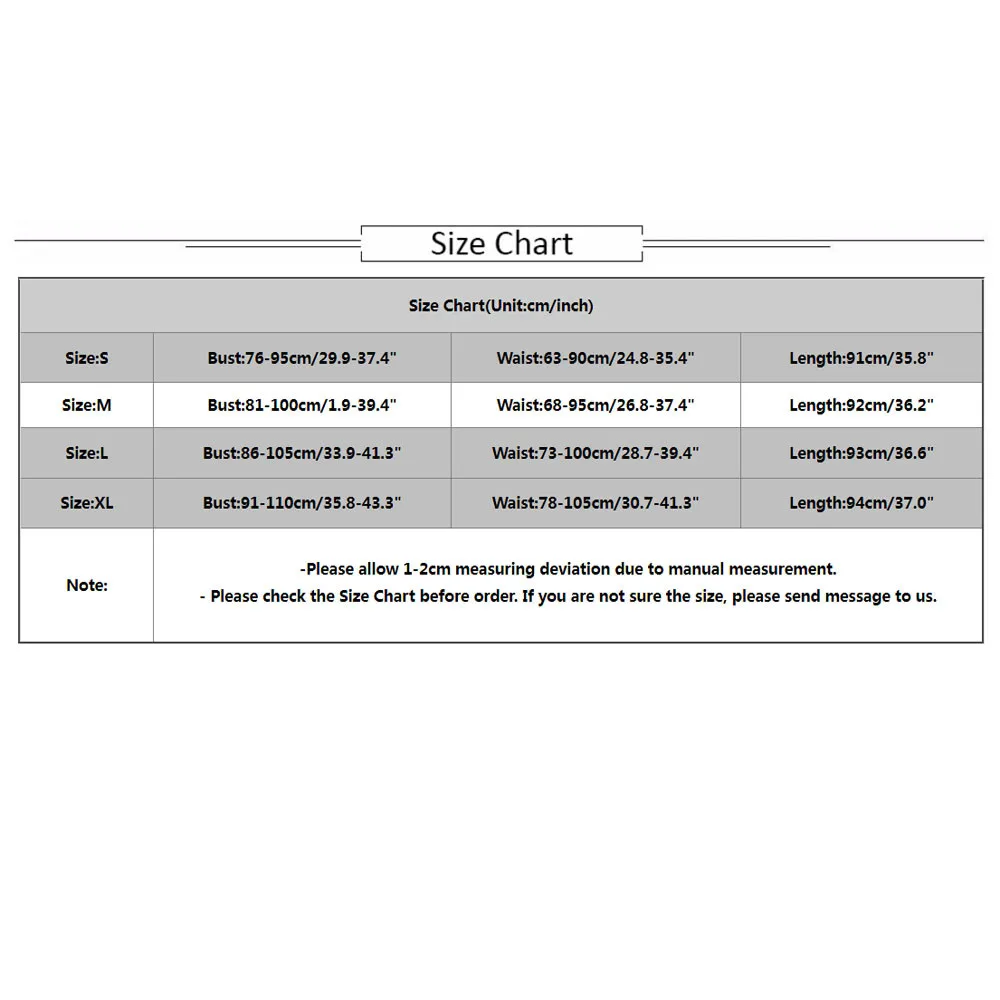 Таблица размеров (единица измерения: см/дюйм) Размер: S Бюст: 76-95 см/29,9-37,4" Талия: 63-90 см/24,8-35,4" Длина: 91 см/35,8" Размер: M Бюст: 81-100 см/1,9-39,4" Талия: 68-95 см/26,8-37,4" Длина: 92 см/36,2" Размер: L Бюст: 86-105 см/33,9-41,3" Талия: 73-100 см/28,7-39,4" Длина: 93 см/36,6" Размер: XL Бюст: 91-110 см/35,8-43,3" Талия: 78-105 см/30,7-41,3" Длина: 94 см/37,0" Примечание:-Допускается отклонение в 1-2 см из-за ручного измерения Измерение.