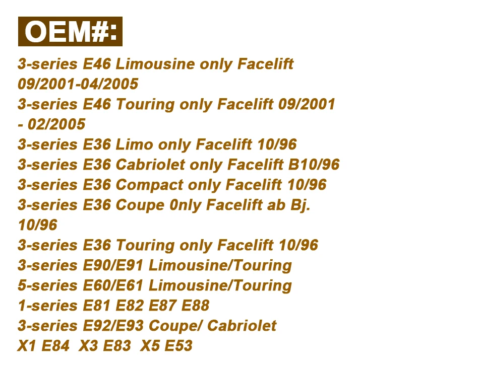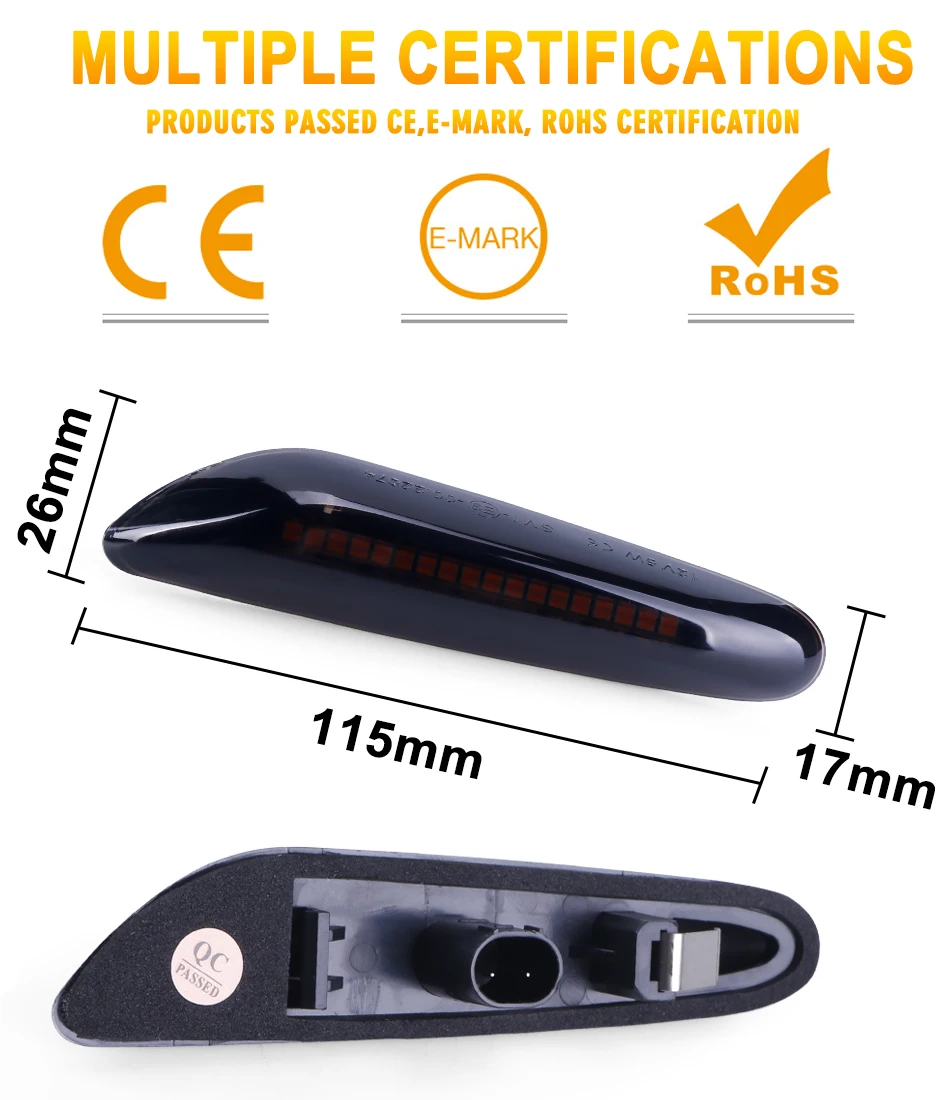 Автомобильный мигалка светодиодный фонарь Canbus указатель поворота динамический последовательный боковой маркер светильник Посылка включает в себя: 2 шт. боковой маркер светильник указатель поворота светильник Подходит для следующих типов транспортных средств: Для BMW E46 лимузин только для лица 09/2001-04/2005 Для BMW E46 Touring only Facelift 09/2001 -02/2005 Для BMW E36 Limo only Facelift 10/96 Только для BMW E36 Cabriolet Facelift B10/96 Для BMWE36 Compact only Facelift 10/96 Для BMW E36 Coupe 0nly Facelift ab Bj. 10/96 Для BMW E36 Touring only Facelift 10/96 Для BMW E90/E91 лимузин/туринг Для BMW E60/E61 лимузин/туринг Для BMW E81 E82 E87 E88 Для BMW E92/E93 Coupe/ Cabriolet Для BMW X1 E84 X3 E83 X5 E53