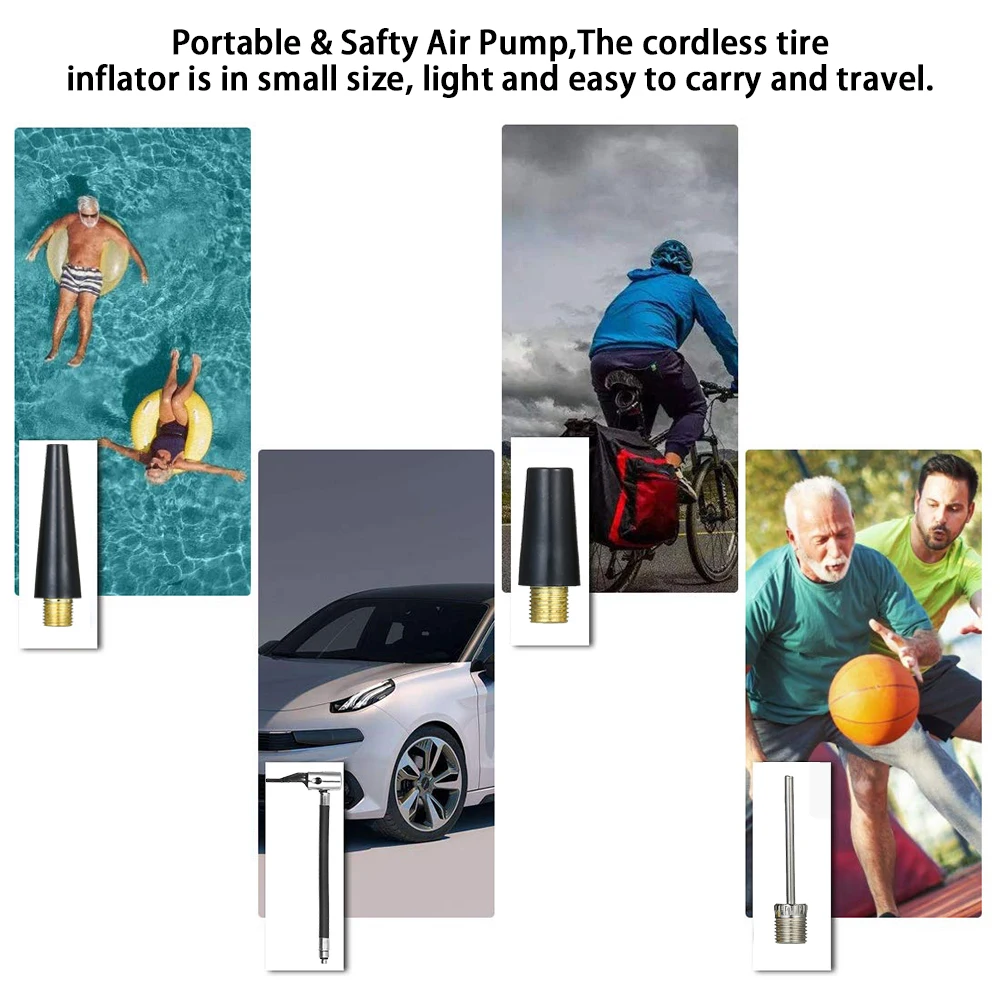 Портативный и безопасный воздушный насос: беспроводной шинный насос имеет небольшой размер, светильник, легко переносить и путешествовать. Профессиональная защита от перегрузки по току, перенапряжения, перезарядки, чтобы вы наслаждались процессом надувания.