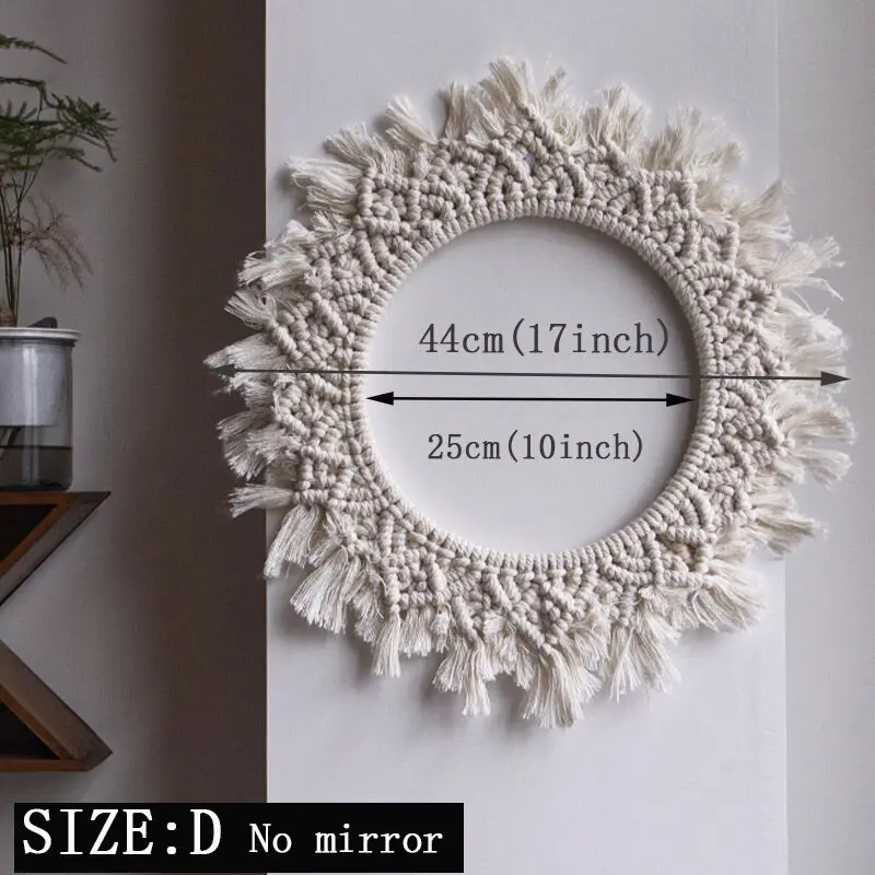 1. Качественный материал: хлопок и зеркальный, идеально подходит для домашнего декора в стиле ретро кантри. 2. Аппликация для: настенных подвесных зеркал макраме отлично впишется в интерьер гостиной, спальни, изголовья кровати, детской комнаты и даже уютного кафе или кабинета, камина. Также как богемные тематические вечеринки, настенные украшения в стиле бохо, рождественские подарки, Рождественский Декор, подарок на день рождения и т. д.