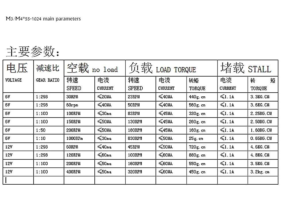 Модель: GA1024-N20-M3 * 55 / M4 * 55 Объяснение: Вы можете выбрать один двигатель или двигатель с кодером, Вал двигателя опционально: резьба M3 / M4 Длина вала: 55 мм Дополнительная Скорость без нагрузки/минута: 6 в: 30 60 100 150 200 300 500 об/мин 12 В: 60 120 200 300 400 600 об/мин Характеристика продукта длинный вал используется для моделей, роботов, шасси. Особенности: 1 .. нет неправильной нити, разбитое явление, плавная работа. 2 .. прецизионная коробка передач. Размеры --------------------------