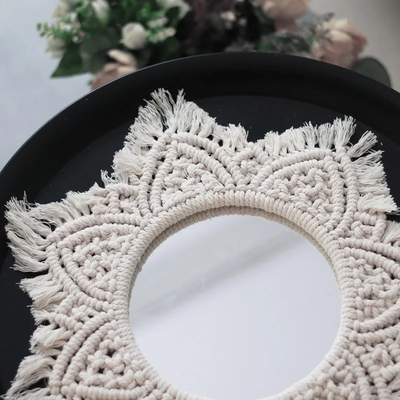 1. Внутренний диаметр: 19 см Общий диаметр: 35 см 2. Материал: хлопковая веревка + зеркало