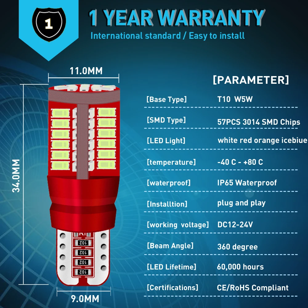1 Всего 57 штук 3014 SMD чипы 2 стандартных T10 , 99% близко к оригинальным галогенным лампам 3 Стабильный IC драйвер, Canbusl без ошибок, подходит для автомобилей 12 В