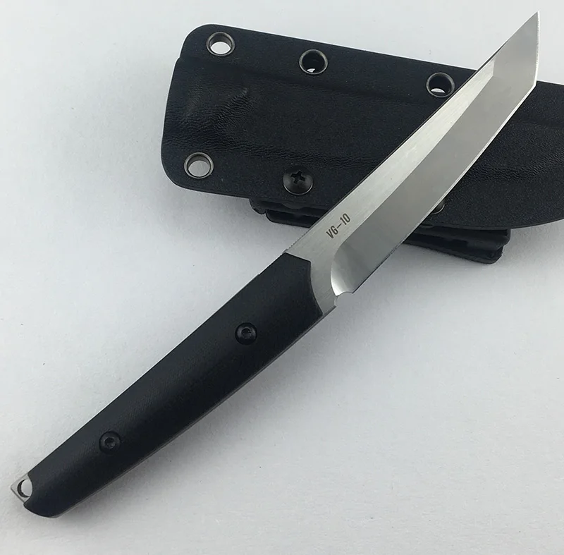 Общая длина: 200 мм Длина лезвия: 98 мм Толщина лезвия: 3,5 мм Материал лезвия: 100% настоящая Vg-10 Твердость: 59-60HRC Отделка лезвия: сатин + каменная стирка Материал ручки: G10 Вес ножа: 115 г KYDEX вес оболочки: 75 г Оболочка: KYDEX