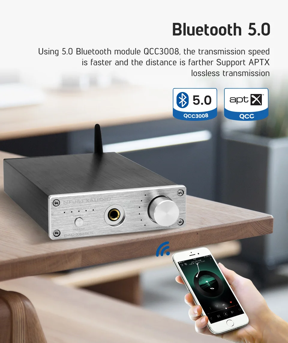 Преобразователь DAC использует QC3008 Bluetooth версии 5,0 с антенной, чтобы обеспечить меньшую потерю сигнала и стабильную передачу. Он поддерживает большинство устройств Bluetooth, таких как мобильные телефоны, ноутбуки и планшеты. Беспроводное соединение делает устройство более удобным в использовании. Bluetooth 5,0 поддерживает APTX