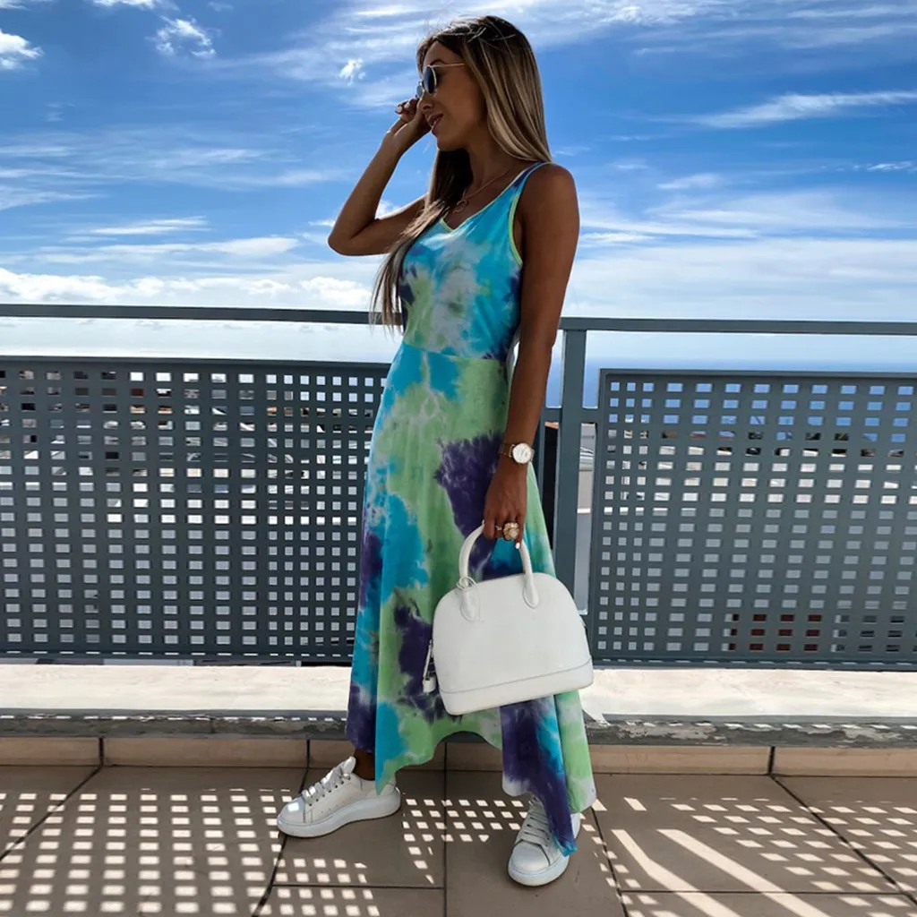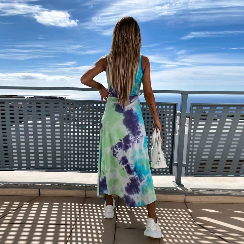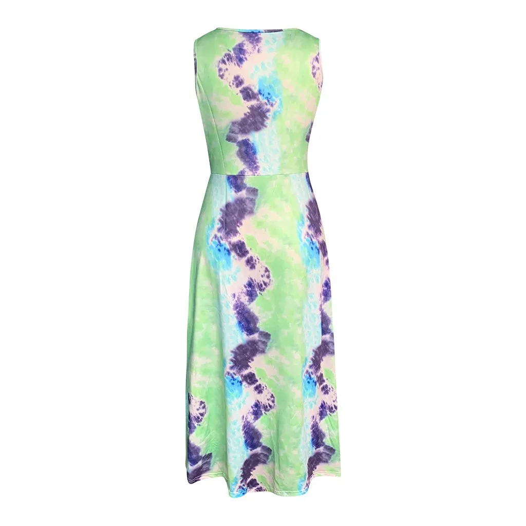 Женский Повседневный Макси-галстук-краска Длинное пляжное платье без рукавов с круглым вырезом в стиле пэчворк