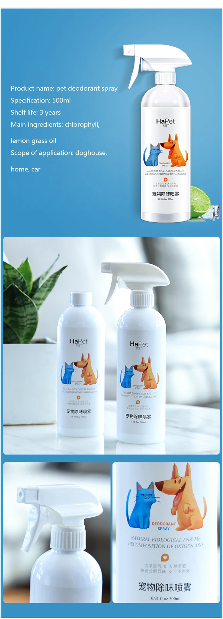 Название продукта: дезодорант-спрей для домашних животных Спецификация: 500 мл Срок годности: 3 года Основные ингредиенты: хлорофилл, масло лимонной травы Область применения: doghouse, home, car Три эффекта в одном Дезодорант + аромат + Бактериостаз Безопасный и нетоксичный Натуральные экологически чистые материалы Не беспокойтесь о том, чтобы вылизывать домашних животных Формула защиты окружающей среды не раздражает Спрей для рук дезодорирует и подавляет бактерии Получите его в бутылке Воняет во всех уголках дома Диван наступил на домашних животных Удаление Запаха кровати Запах в распылительной машине Запах после похода к собаке Спрей для кошки для удаления запаха