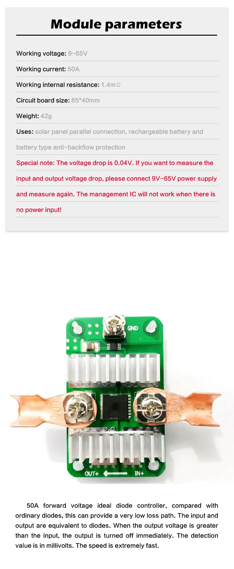 50A идеальный регулятор диодов переднего напряжения, по сравнению с обычными диодами, это может обеспечить очень низкий путь потери. Вход и выход эквивалентны диодам. Когда выходное напряжение больше входного, выход выключается немедленно. Значение обнаружения в милливольтах. Скорость очень быстрая.