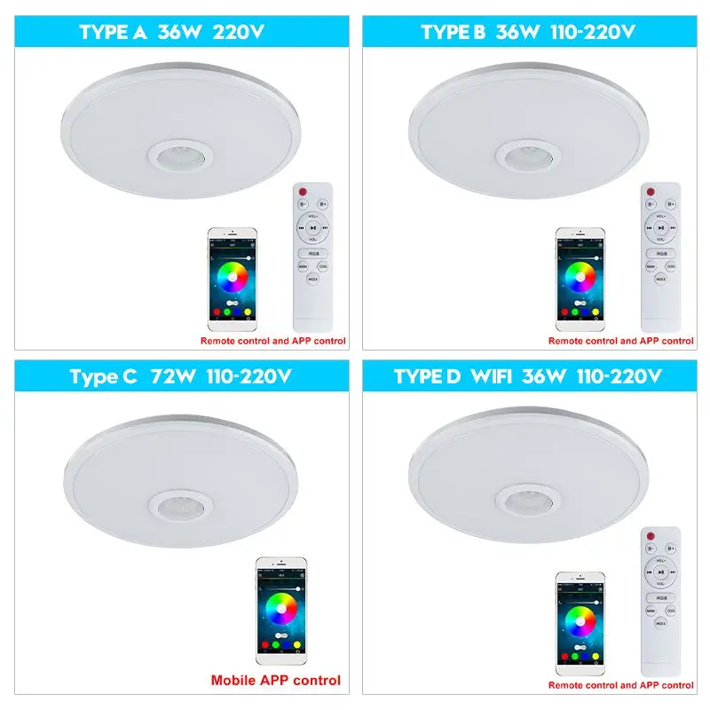 * Мобильное приложение и bluetooth могут регулировать яркость, менять цвет, пульт дистанционного управления может включить и выключить светильник, регулировать яркость и цвет, проигрывать песни, регулировать громкость, это такой умный потолочный светильник, который изменит вашу концепции на потолочный светильник, Это как верный друг, который позаботится о вашем настроении.