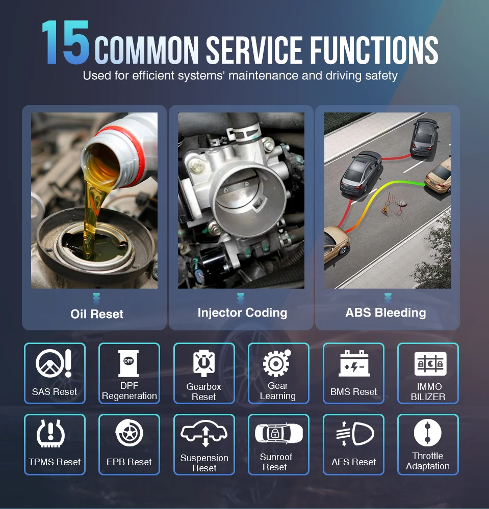 1. Служба сброса масляной лампы: Позволяет выполнить сброс для нового подсчета срока службы моторного масла после изменения масла. 2.EPB сервис: Это важно для поддержания безопасности и эффективности электронной тормозной системы. 3. Обслуживание батареи летучей мыши: Позволяет инструменту сканирования оценить состояние заряда батареи, контролировать ток замыкания, зарегистрировать замену батареи и активировать состояние остальной части транспортного средства. 4. Служба DPF: Специально работает для дизельной системы Сажевых фильтров с регенерацией DPF, замена компонентов DPF teach-in и DPF teach-in после замены блока управления двигателем. 5. Обслуживание SAS: Помогает очистить память датчика угла поворота руля и играет важную роль в калибровке датчика угла поворота руля. 6. Услуги TPMS: Имеет значение в отображении идентификационных кодов датчиков от ЭБУ транспортного средства, вводе идентификационных кодов замены датчика TPMS и тестовых датчиков. 7. Программирование ключей IMMO: Уникальное Программирование автомобильных ключей и функция считывания ПИН-кода, он в основном используется для отключения ключей от утерянного автомобиля и программирует Новый Сменный брелок для ключей. 8.ABS кровотечение: ABS тормозное кровотечение для получения твердой тормозной колодки после изнеможения воздуха после ремонта ABS насосной системы 9. Сброс люка: Память люка, как правило, должна быть сброшена, когда аккумулятор автомобиля заменен или автомобиль погибает 10. Сброс подвески: Попробуйте сбросить электронное подвесное Воздушное движение с массажной системой закройте все двери koeo флип через measagesystem перейти к подвеске сброс oron off 11. Сброс коробки передач: Процедура сброса передачи Адаптивное обучение DIY. Начните машину и ведите машину. После выполнения этой процедуры блок управления двигателем (ECU) и блок управления коробкой передач (TCU) будут работать вместе, чтобы узнать, как Вы управляете, отслеживая вашу модель вождения. После того, как вы выполните этот метод программирования TCU / ECU диск автомобиля. 12. Сброс фары AFS: «AFS» означает адаптивную систему переднего освещения (ночью с биксеноновыми фарами), которая вращается с любой стороны, нажимая на эту кнопку, означает, что они остаются направленными прямо вперед и не поворачиваются при повороте рулевого колеса 13. Кодирование инжектора: Протекающие инжекторы и некоторые мертвые инжекторы могут быть пропущены, даже если инжектор отключен. Другие проблемы с системой зажигания и механическими компонентами также могут не показать потерю оборотов при выключенном инжекторе 14. Адаптация дроссельной заслонки: Корпус дроссельной заслонки представляет собой трубу с поворотным плоским клапаном (бабочкой), который используется для контроля количества воздуха, входящего в двигатель. В автомобиле с электронным впрыском топлива Датчик положения дроссельной заслонки и датчик воздушного потока связываются с компьютером, который поставляет необходимое количество топлива на инжекторах. Необходимо переосваивать Положение датчика дроссельной заслонки после очистки или ремонта 15. Обучение снаряжению: Инструмент сканирования отслеживает сигналы некоторых датчиков положения распределительного вала, чтобы определить, выполнены ли все условия, чтобы продолжить процесс работы двигателя