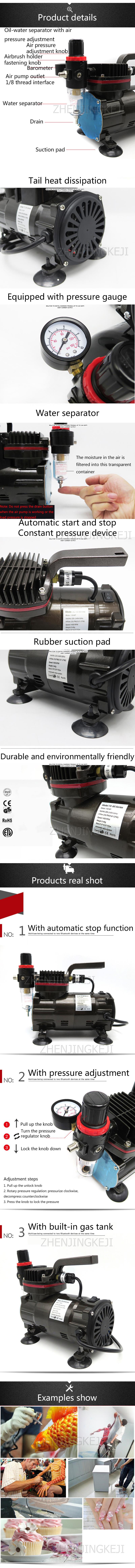 Модель: PBQB-01 Напряжение: 220 / 110V Мощность: 110 Вт Вес изделия: 4 кг Размер изделия: 255*135*205 мм Поток: 23-25л/мин Шум: 40dB Давление остановки: 4bar / 57Psi Пусковое давление: 3 бар/43Psi Скорость двигателя: 1450 об/мин/50 Гц 1700 ОБ/мин/60 Гц Давление воздуха: 1 / 5 л. С. Винт: 1 / 8BSP / NPT Длина провода: 1,9 м