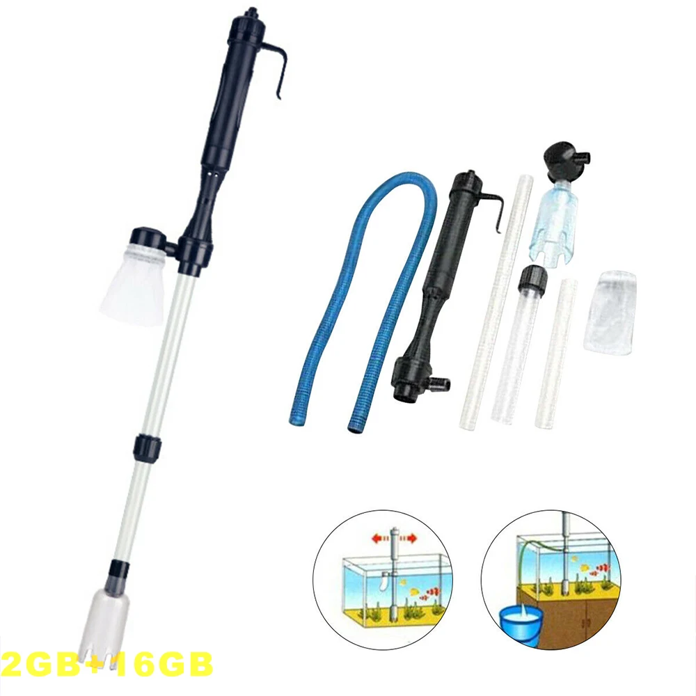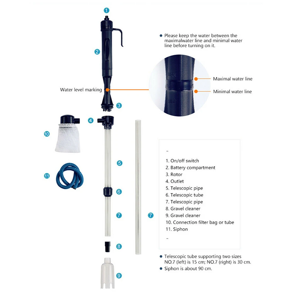 -Мощный сифонный насос для упрощения работы с грязью и чисткой рыболовных отходов. -Гибкая и растягивающаяся трубка для регулировки длины, подходящей для различной глубины воды. -Поставляется с двумя всасывающими трубками, работающими как для больших, так и для небольших аквариумов. -Поставляется с гравием и песком, мешок сетчатого фильтра, полностью повторен для длительного использования. -Чехол для аккумулятора сверху, только 2 батарейки, необходимые для простой и безопасной установки. -Эргономичная ручка для безопасного и удобного использования с легкостью.