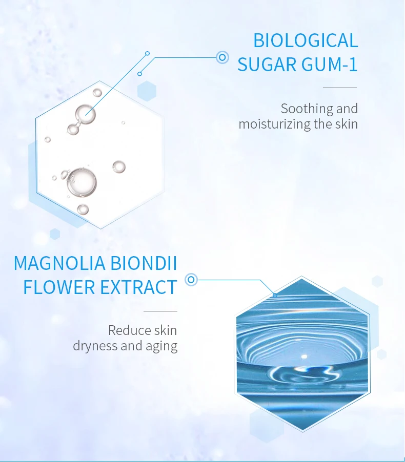 1. Успокаивает и увлажняет кожу 2. Уменьшает сухость кожи и старение 3. Увлажнение и питание 4. Экстракт бетаина, увлажняющий фактор аминокислоты: антивозрастной и успокаивающий 5. Экстракт магнолии Biondii: успокаивающий дискомфорт кожи, восполняет питательные вещества и гитрат кожи, уменьшает тонкие линии 6. Маски: мягкий tencel материал