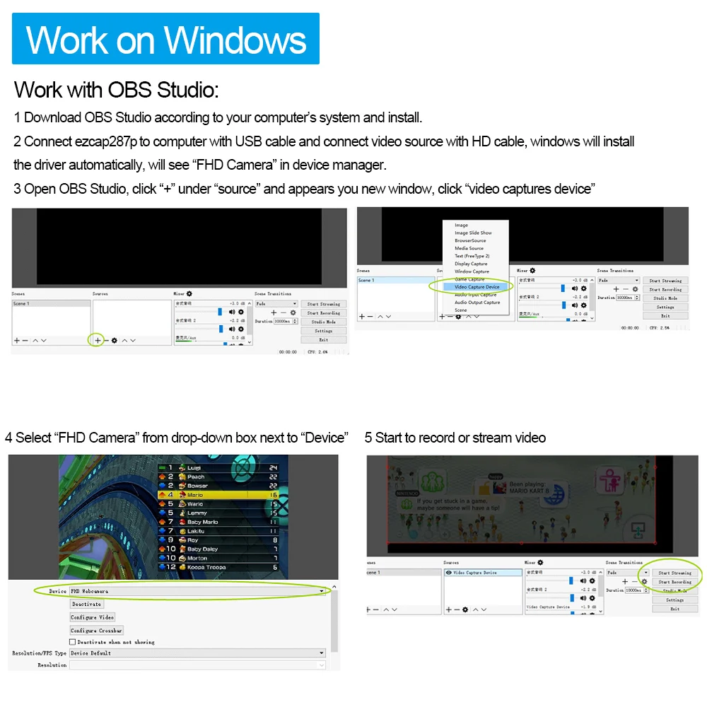 С помощью этой игры ezcap287P Full HD вы можете запечатлеть свою HD игру или другой hd-источник видео с помощью любого стороннего программного обеспечения, просто подключите его к вашему ПК (для windows / Mac / Linux). Нет необходимости устанавливать драйвер.