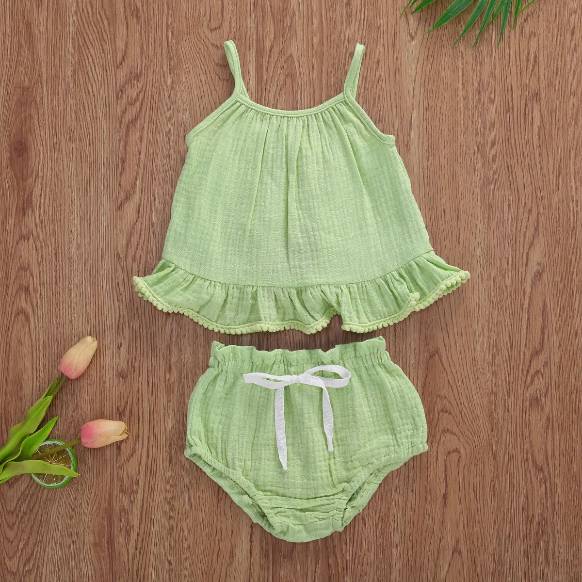 Комплект одежды из 2 предметов для маленьких девочек однотонная Свободная рубашка на бретельках с оборками и кисточками Короткие штаны с эластичным поясом и треугольным рисунком