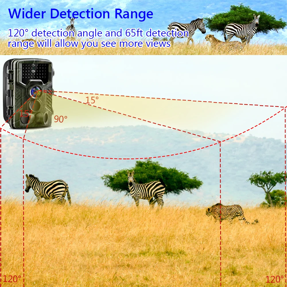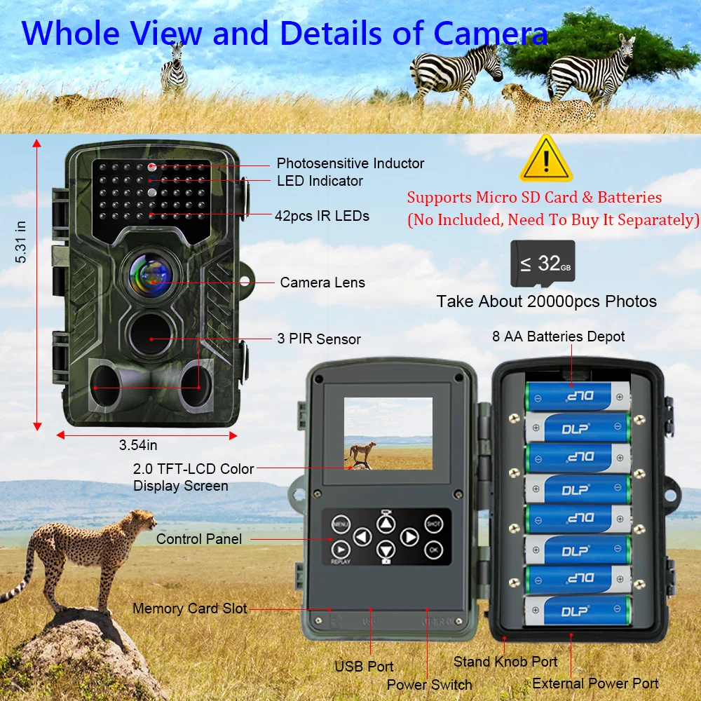 Особенности -120 градусов 1080P HD PIR сенсор камера, поддержка 20MP/16MP/12MP/8MP Выбор разрешения изображения, 1080P 30fps видео. Инфракрасная камера для съемки диких животных. -1/5 / 10 / 30 секунд/минут интервал между движениями по желанию. Камера может быть запрограммирована для работы как в режиме PIR, так и в режиме time lapse. -ИК-вспышка для цветного фото/видео дня или черно-белого фото/видео в ночное время. HD видео (1080P) со звуком. -Реальная температура, время и дата должны быть штампованы на картинке, так что вы знаете, когда фотография или видео были сделаны. -42 шт. ИК-светодиодов, Супер дальний диапазон обнаружения до 20 м/66 футов. Триггер время 0,3 s, быстро огонь серийную съемку, никогда не пропустите ни одного важного картину. -IPX65 герметичный водонепроницаемый внешний вид, эффективно предотвращает попадание пыли и насекомых в дождевую воду. -Поддержка Micro SD карты (до 32 Гб)/USB / AV выход (sd-карта не входит в комплект). -Отличный инструмент для охоты, путешествий, кемпинга, отслеживания домашних/диких животных. Простота в использовании и креплении. -Это может быть вызвано любым движением человека (или животных) в определенной области, контролируемой датчиком движения. -Инфракрасный пульт является входным устройством камеры и в основном используется для настройки клиента. Максимальное расстояние дистанционного управления составляет 20 метров. -С фиксированной веревкой с пряжкой, легко крепится к стержням дерева и веткам дерева. Обратите внимание -Пожалуйста, вставьте tf-карту, когда камера выключена. -Пожалуйста, не вставляйте и не вынимайте tf-карту при включении камеры. -Рекомендуется Форматировать tf-карту камерой при первом использовании. -Камера будет находиться в режиме USB при подключении к usb-порту компьютера. В этот чехол, TF карты функция в качестве съемного диска. -Пожалуйста, убедитесь, что при обновлении прошивки достаточно мощности, в противном случае процесс обновления может быть прерван неправильно. Если какая-либо ошибка возникла после неправильного процесса обновления, камера может остановить функцию должным образом. Посылка детали: 1 X HC800A Камера USB кабель (1 шт.); 1 х Зажим для ремня Руководство пользователя-1 шт.;