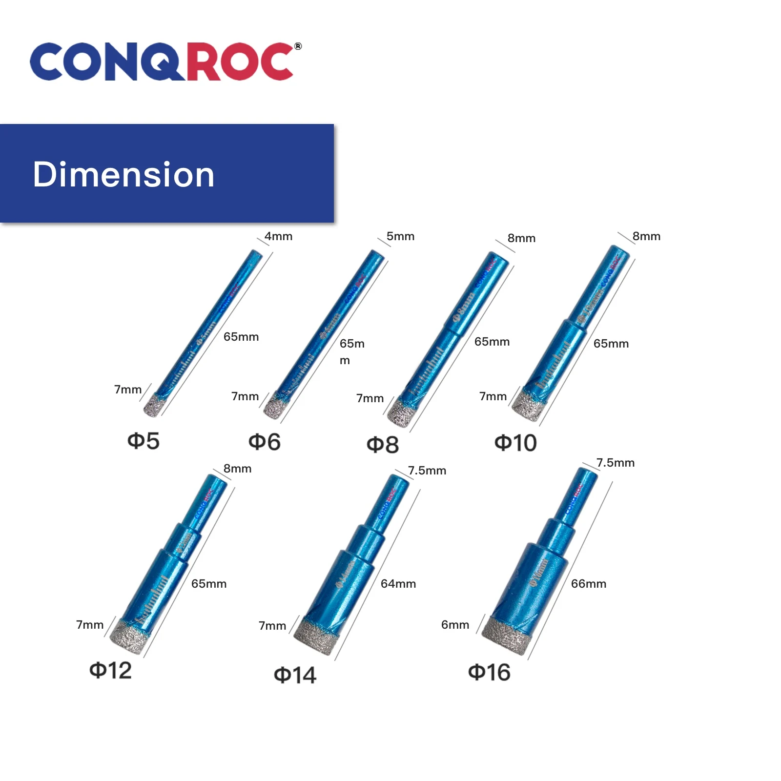 -Вся длина: 65 мм -Длина алмазного покрытия: 6 мм ~ 7 мм -Диаметр сверления: 5 мм, 6 мм, 8 мм, 10 мм, 12 мм, 14 мм, 16 мм -Глубина сверления: менее 30 мм
