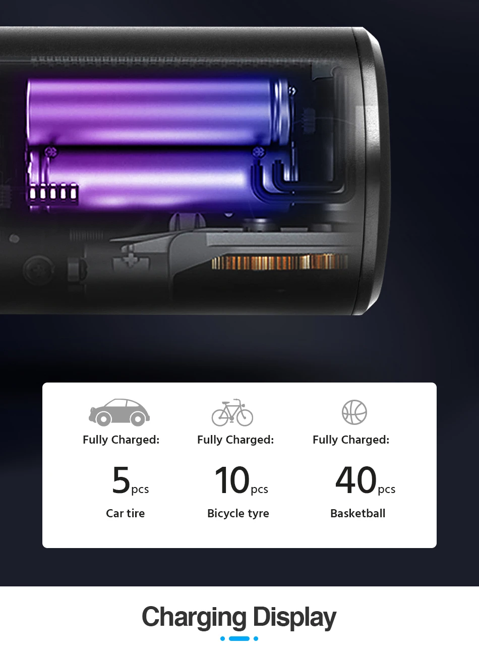 ● Перезаряжаемая батарея большой емкости: с 2000 мАч сертифицированным литий-ионным аккумулятором, этот портативный компрессор готов надуть велосипед, мяч и т. д. usb-порт для зарядки поддерживает быструю зарядку.
