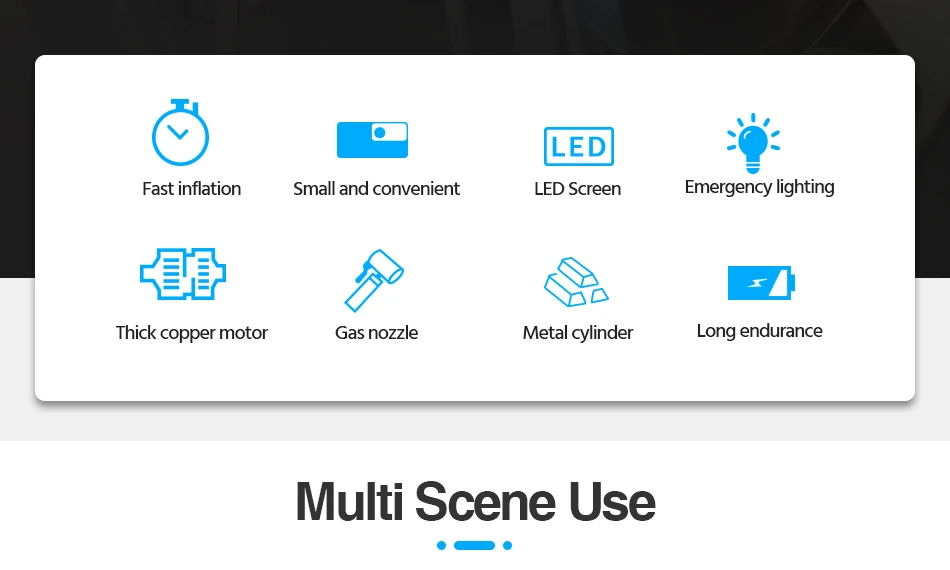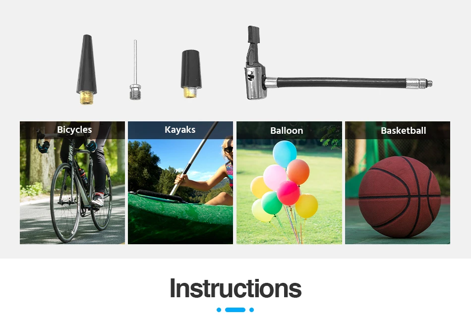 ● Многофункциональный: этот воздушный компрессор поставляется с 3 адаптерами сопла. Можно надуть рядом с шинами, а также шариками, воздушными матрасами, игрушками.
