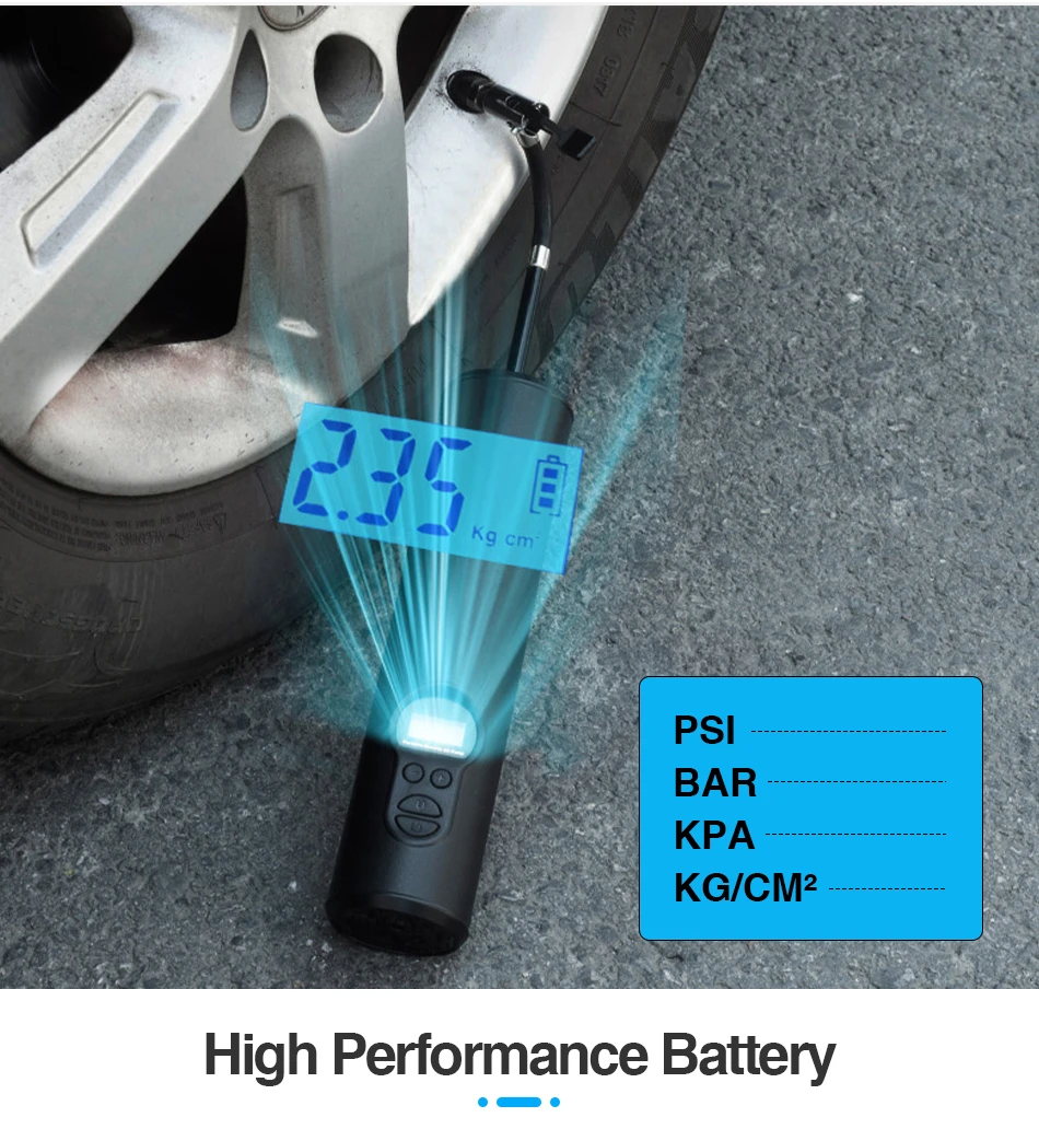 ● Беспроводной и портативный: беспроводной дизайн и компактный мини-размер делают воздушный компрессор портативным и простым в эксплуатации одной рукой. Компрессор готов всего за 4 шага. ЖК-дисплей показывает давление воздуха. Подходит для надувания, когда автомобильные шины недостаточны и полностью надуты шины для велосипедов и мотоциклов;