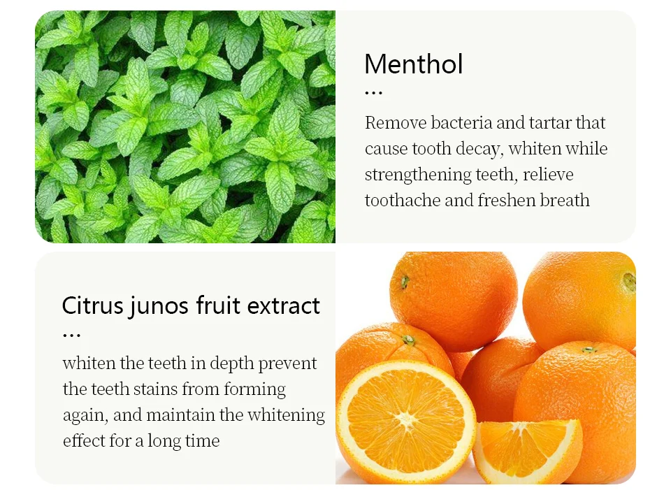Ментол Удаление бактерий и зубного камня, вызывающих кариес, отбеливание во время поглощения зубов, снятие зубной боли и освежение дыхания Экстракт фруктов цитрусовых ЮНОН Отбеливайте зубы на глубине, предотвращая повторное образование пятен зубов, и надолго сохраняйте эффект отбеливания