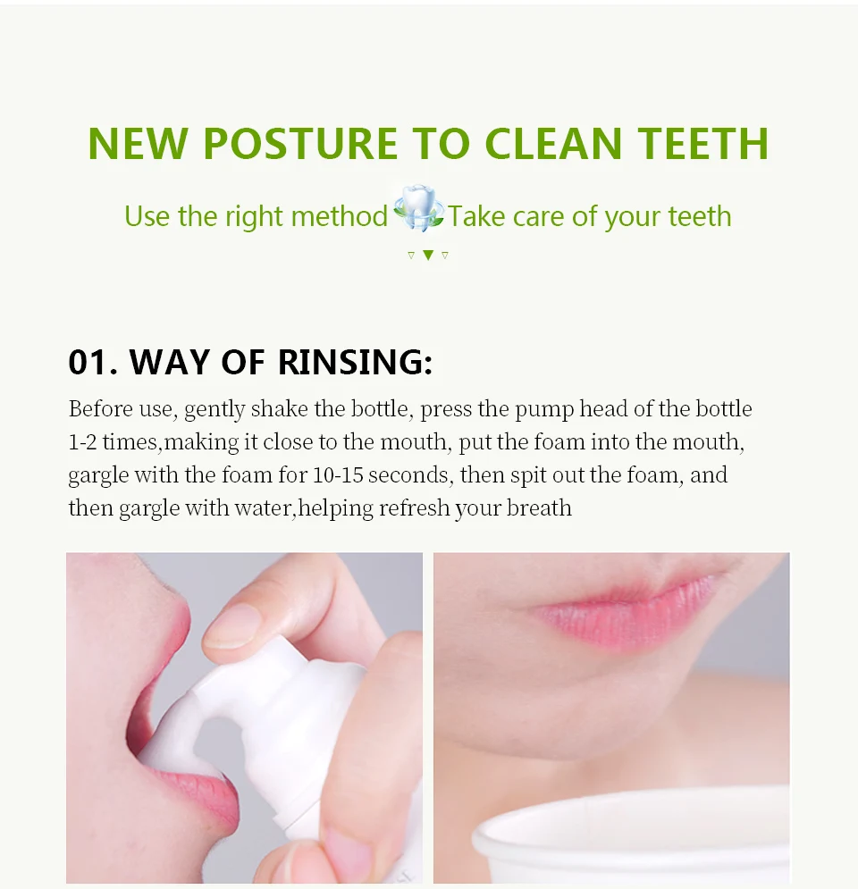Используйте правильный метод, позаботьтесь о своих зубах 01. Способ полоскания: Перед использованием аккуратно встряхните бутылку, нажмите на головку насоса bottle1-2 раз, приближая ее к рту, положите пену в рот, промойте пену 10-15 секунд, затем выплюньте пену, а затем промокните водой, помогая освежить дыхание 02. Способ чистки зубов: Перед использованием аккуратно встряхните флакон, нажмите на головку насоса 1-2 раза, наполните соответствующее количество пены на зубную щетку Ротом, промокните пенкой около 15 секунд, чистите зубы зубной щеткой в течение 2-3 минут, затем выплюните пену и промокните водой [Теплый совет]: рекомендуется использовать его каждое утро и вечером для очистки рта. Непрерывное использование сохранит ваши зубы и десны здоровыми