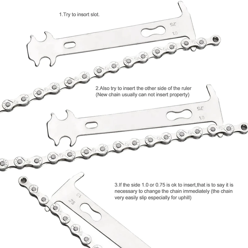 Индикатор износа цепи: чтобы помочь вам понять, когда пришло время изменить велосипедную цепь, мы включаем проверку износа цепи и индикатор для оценки состояния цепи. Простой в использовании, если зуб 0,75 или 1,0 проходит через цепь, то пришло время изменить его