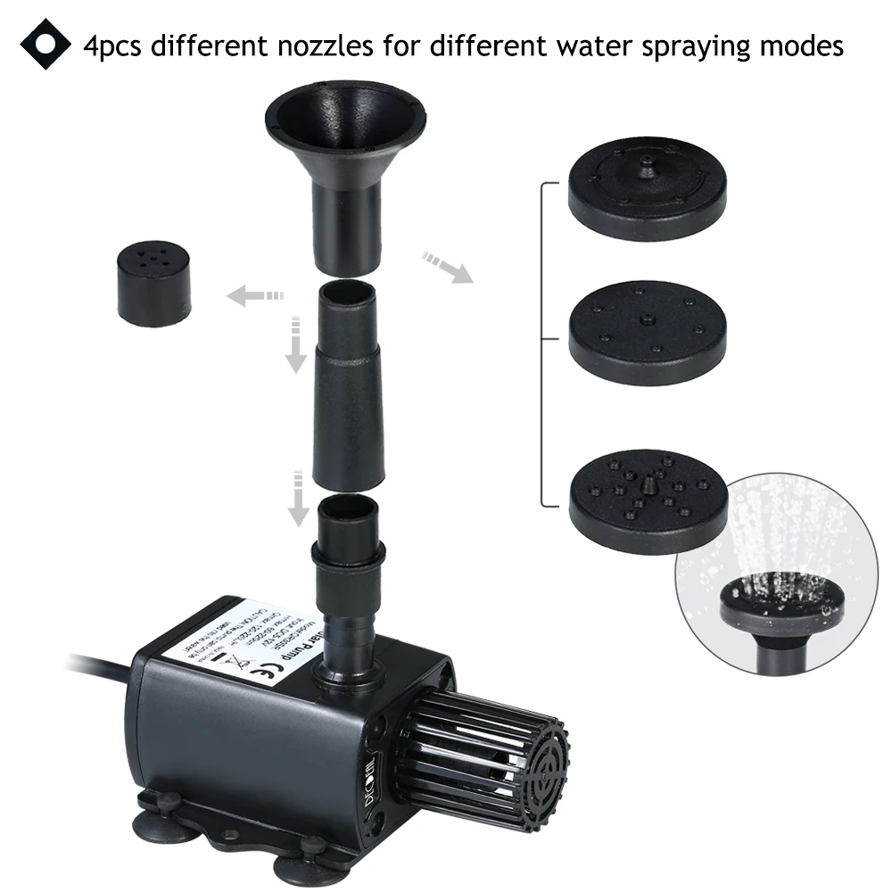 4 шт. различные фонтанные насадки в комплекте; Макс. Высота воды: 40-60 см (1,2 Вт); 50-80 см (1,5 Вт); 50-80 см (2 Вт); 50-80 см (3 Вт)