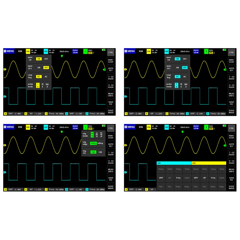 До 12 параметров измерения: VPP,VP,Vmax,Vmin,Vavg,Vrms, частые, Duty +,Duty-,Time +,Time-,Period.