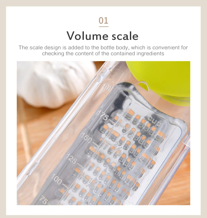 Это многофункциональное устройство, хороший кухонный помощник, он не только может Измельчить чеснок имбиря, но также может использоваться в качестве бутылки для приправ, чтобы избежать других специй, прост в использовании.