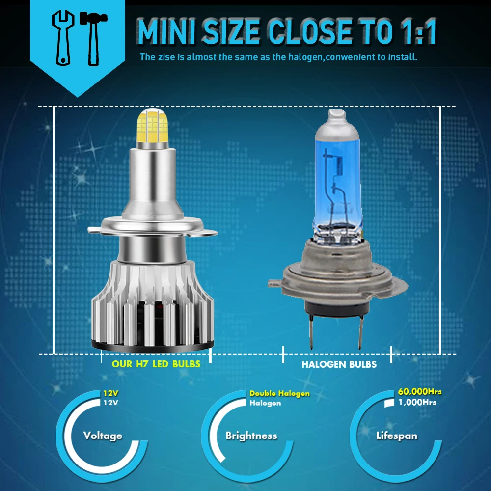Мощность: 60 Вт Светодиодный Количество: 8 граней 48PCS-CSP 3D чипы Световой поток: 16000lm Рабочее напряжение: DC12V 24V Рабочий ток: 1A Цветовая температура: 6000K холодный белый Степень защиты: IP68 Номинальное уплотнение воды и пыли Рабочая температура: -40-80 градусов Цельсия Срок службы: более 50 000 часов Использование: головной светильник, противотуманный светильник Встроенный Турбовентилятор для охлаждения. Меньший дизайн теплоотвода, применяется для 99.99% автомобиля. Подключите и играйте, замените оригинальные галогенные и тусклые лампы в течение 10 минут.