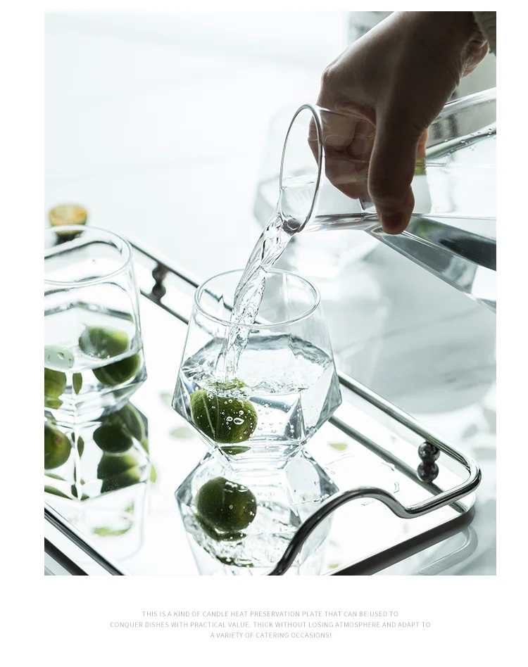 100% новый товар высокого качества. Красивый внешний вид, Элитная роскошь Тонкая работа и длительный срок службы. 1. Высококачественный материал: Этот кувшин для воды изготовлен из стекла, термостойкий (0-100 °C) 2. Красивый внешний вид: скандинавский стиль Прозрачный Алмазный чайник 3. Легко чистить: просто мыть водой 4. Применение: ледяная вода, горячая вода, чай, ча, цветочный чай, сок, вино, лимонад, напиток и т. Д. 5. Характеристики: чайник * 1/чашка для воды * 4/лоток * 1 Размеры Чайник: высота 22,5 см/ширина 16,5 см/горлышко бутылки 6,3 см/емкость ≈ 1300 мл Чашка: высота 9 см/ширина 16,5 см/горлышко бутылки 6,3 см Лоток из нержавеющей стали: высота 5 см/длина 35 см/ширина 21 см