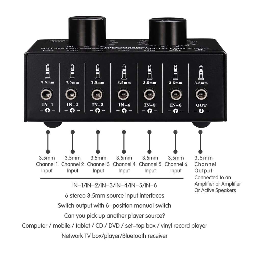* В изделии используется стандартная 3,5 мм дизайн интерфейса для ввода и вывода, и использует точную 6-уровневый ручной переключатель дизайн для переключателя, с стерео регулировки громкости.