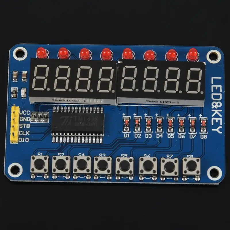 8 шт. кнопок 8 шт. светодиодный 8 цифровой трубки, в общей сложности светодиодный катодный цифровой трубки STC и другие микроконтроллеры могут быть подключены непосредственно VCC GND подключения 5 в источник питания, STB CLK DIO микроконтроллер IO порт