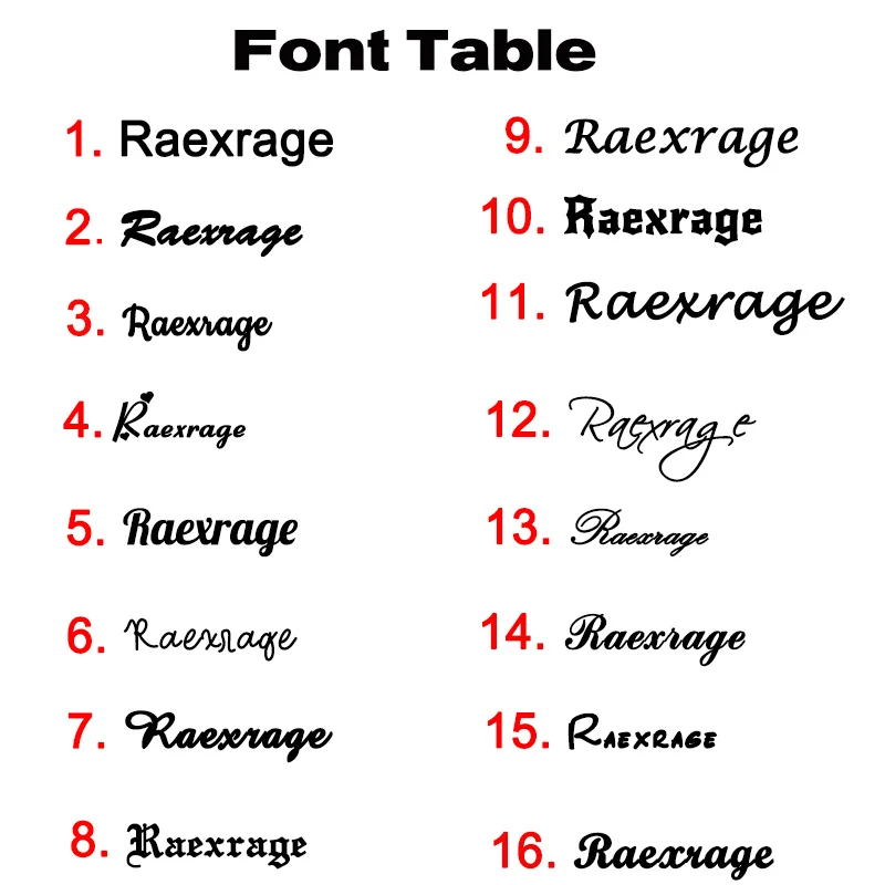 1. Только на английском языке можно выбрать шрифт. Если вы размещаете заказ на арабский язык, пожалуйста, отправьте его напрямую на арабский, и мы можем сделать только арабский с обычным шрифтом. 2. Если вы не сообщите шрифт, мы можем сделать только ваше имя с шрифтом по умолчанию: number1