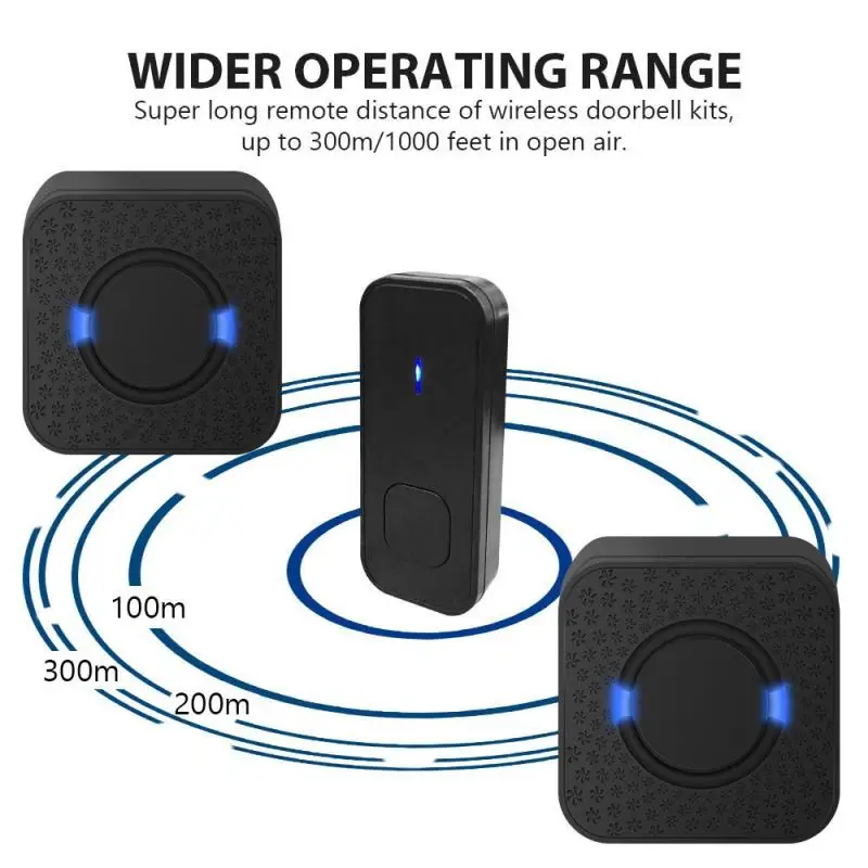 -Дистанционный дальность действия 300 метров на открытом воздухе, что позволяет легче слышать дверной звонок, где бы вы ни находились в вашем доме, вы можете взять передатчик по всему дому и не пропустите прибытие посетителей.